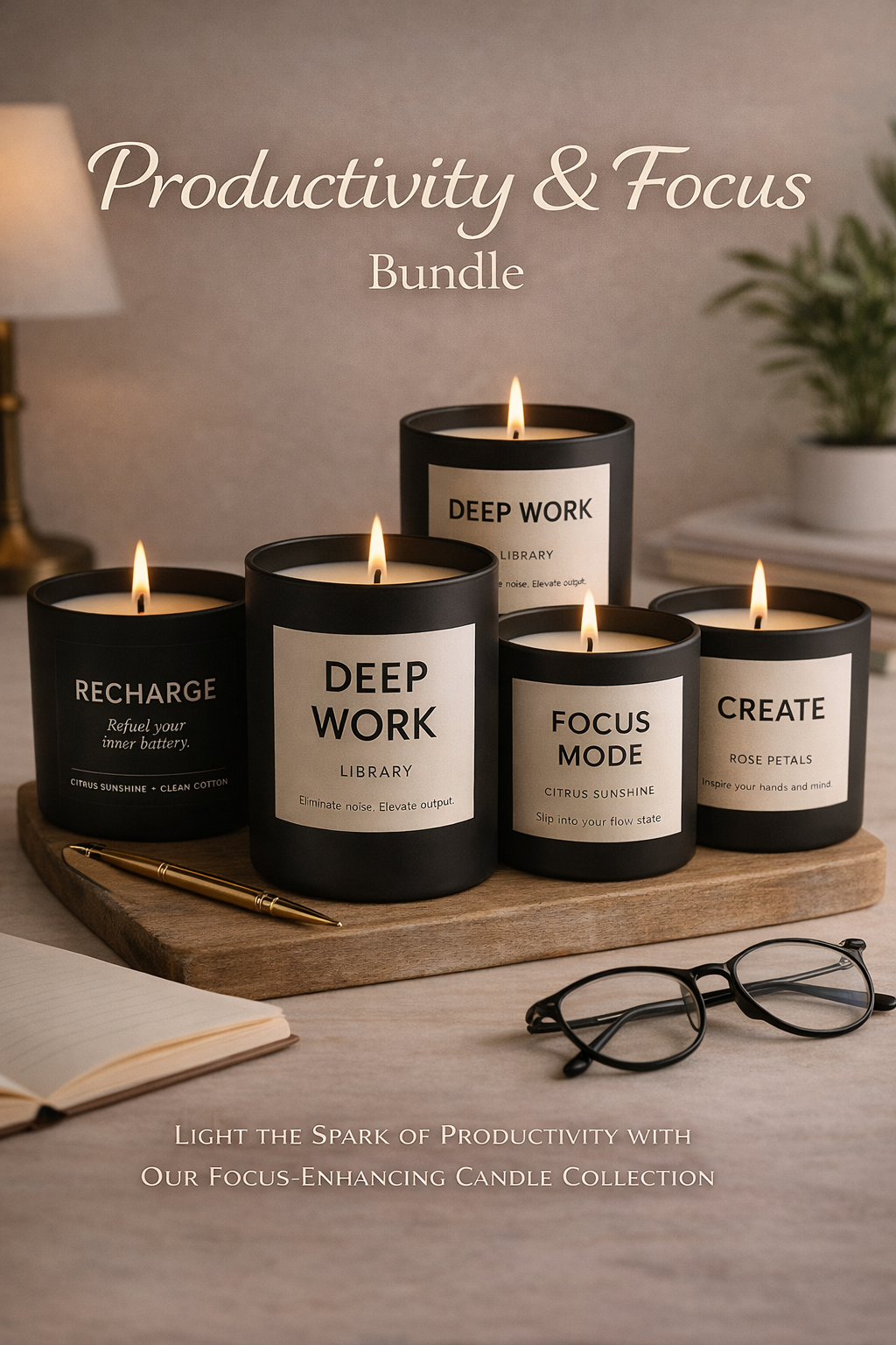Enjoy the variety of all our Productivity & Focus collection. All 5 candles in 8oz sizes for you to enjoy.